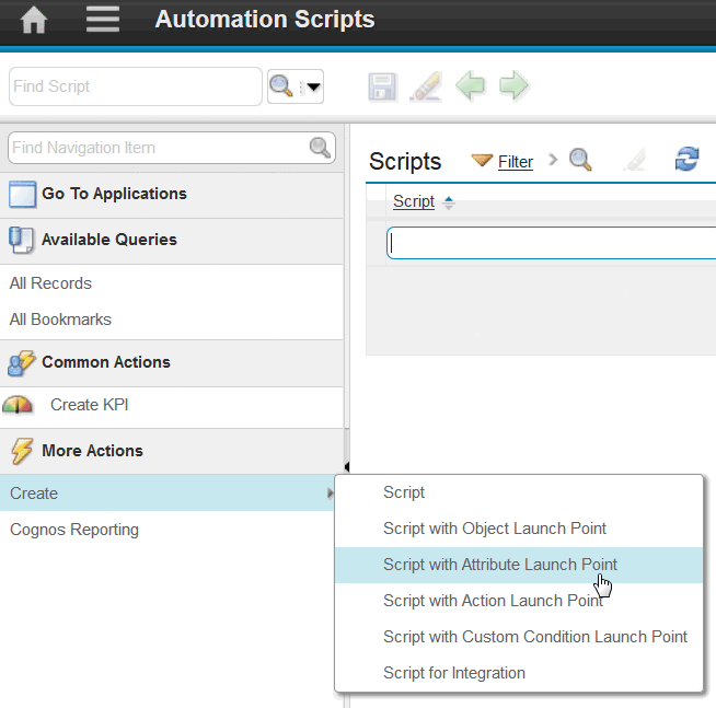9. Dans le menu « Plus d'actions », cliquez sur « Créer » et sélectionnez le « Script avec l' attribut Launch point » l' action .
