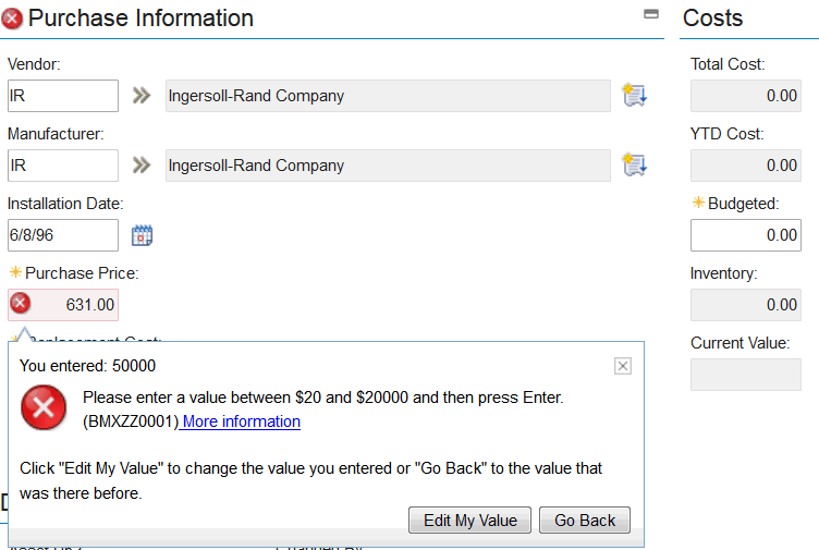 Cliquez sur la croix rouge pour le message d'erreur. Le message d'erreur indique: "BMXZZ0001E - Entrez une valeur comprise entre 20 et 20000 $, puis appuyez sur Entrée."